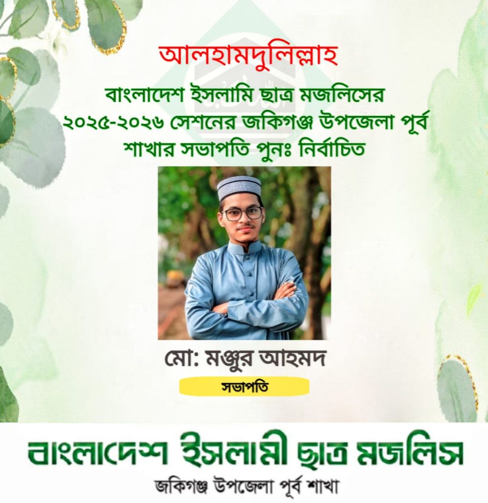 ◑ছাত্র মজলিস জকিগঞ্জ উপজেলা পূর্ব শাখার নতুন সভাপতি হিসেবে নির্বাচিত হয়েছেন মো. মানজুর আহমদ। জানা গিয়েছে, তিনি অতিতে ২০২২-২৩ এবং ২৩-২৪ সেশনের এই শাখায় সভাপতি ছিলেন। বিদায়ী সভাপতি এ এম উসামা আহমেদ স্থায়ীভাবে লন্ডনে প্রবাসে যাওয়ায় অবশিষ্ট মেয়াদের জন্য নতুন নেতৃত্ব নির্বাচনের প্রয়োজন হয়।