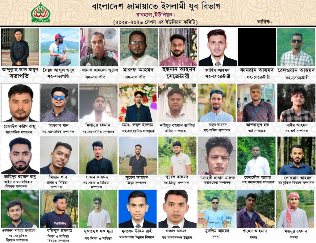 নিজস্ব প্রতিবেদক: বারহাল ইউনিয়ন জামায়াতে ইসলামী যুব বিভাগের ২০২৫-২০২৬ সেশনের নতুন কমিটি ঘোষণা করা হয়েছে। আব্দুল্লাহ আল মামুনকে সভাপতি এবং হুসনান আহমদকে সেক্রেটারী মনোনীত করে ৩২ সদস্য বিশিষ্ট এই কমিটি গঠন করা হয়।